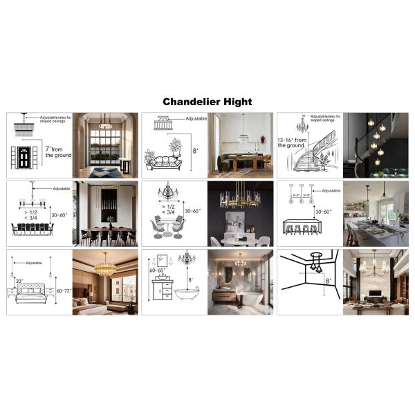 | Size | Chandelier Body: 61" diam., 56"H Minimum Height: 56" Maximum Height: 128¾" Canopy: 8" sq., ¾"H Rods: two 6", eight 7", two 12", eight 13", two 18", eight 19" Cord: 12'L |
